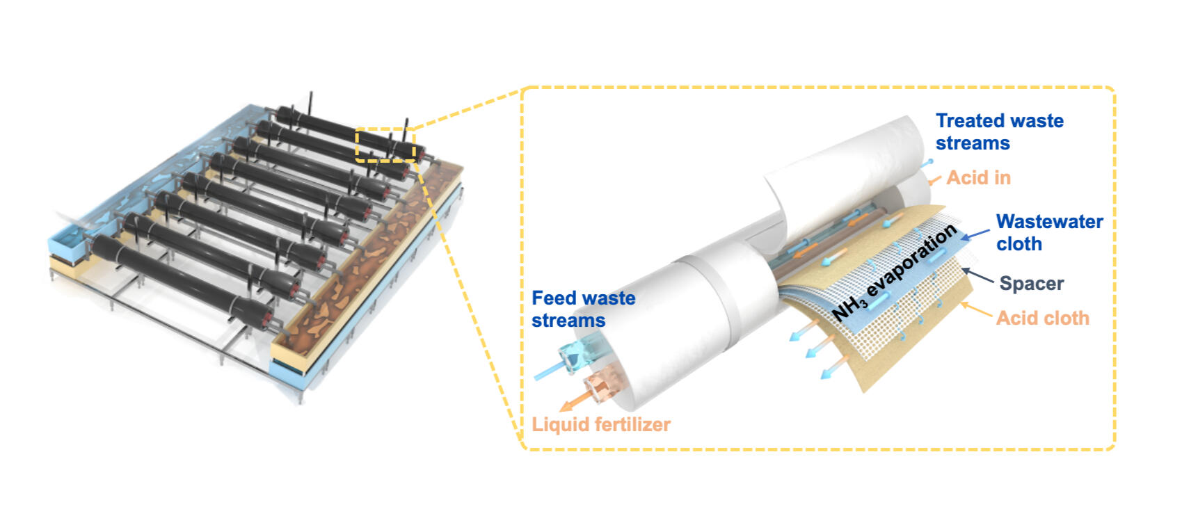 The SWIE module include three layers with a spacer between the wastewater cloth and the acid cloth. Under the solar or other low-grade waste heats as energy input, the ammonia is evaporated from wastewater cloth and captured in acid cloth.